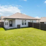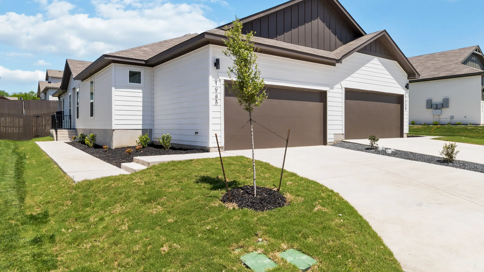 One story duplex featuring 1,303 square feet of living space, 3 bedrooms, 2 baths, 2 car garage per side, and 2,606 square feet total. Large backyards feature covered patios, full sod with irrigation, and privacy fences,