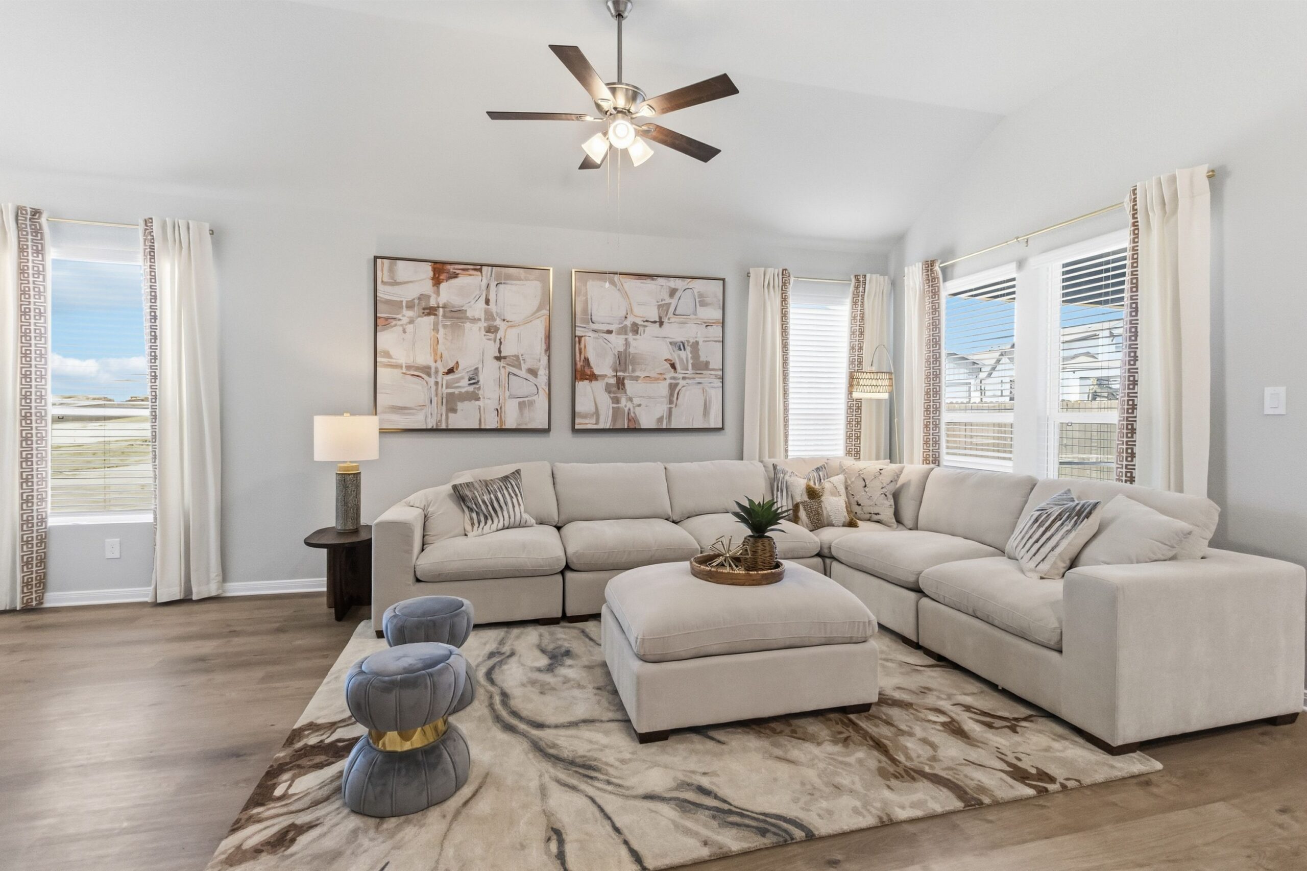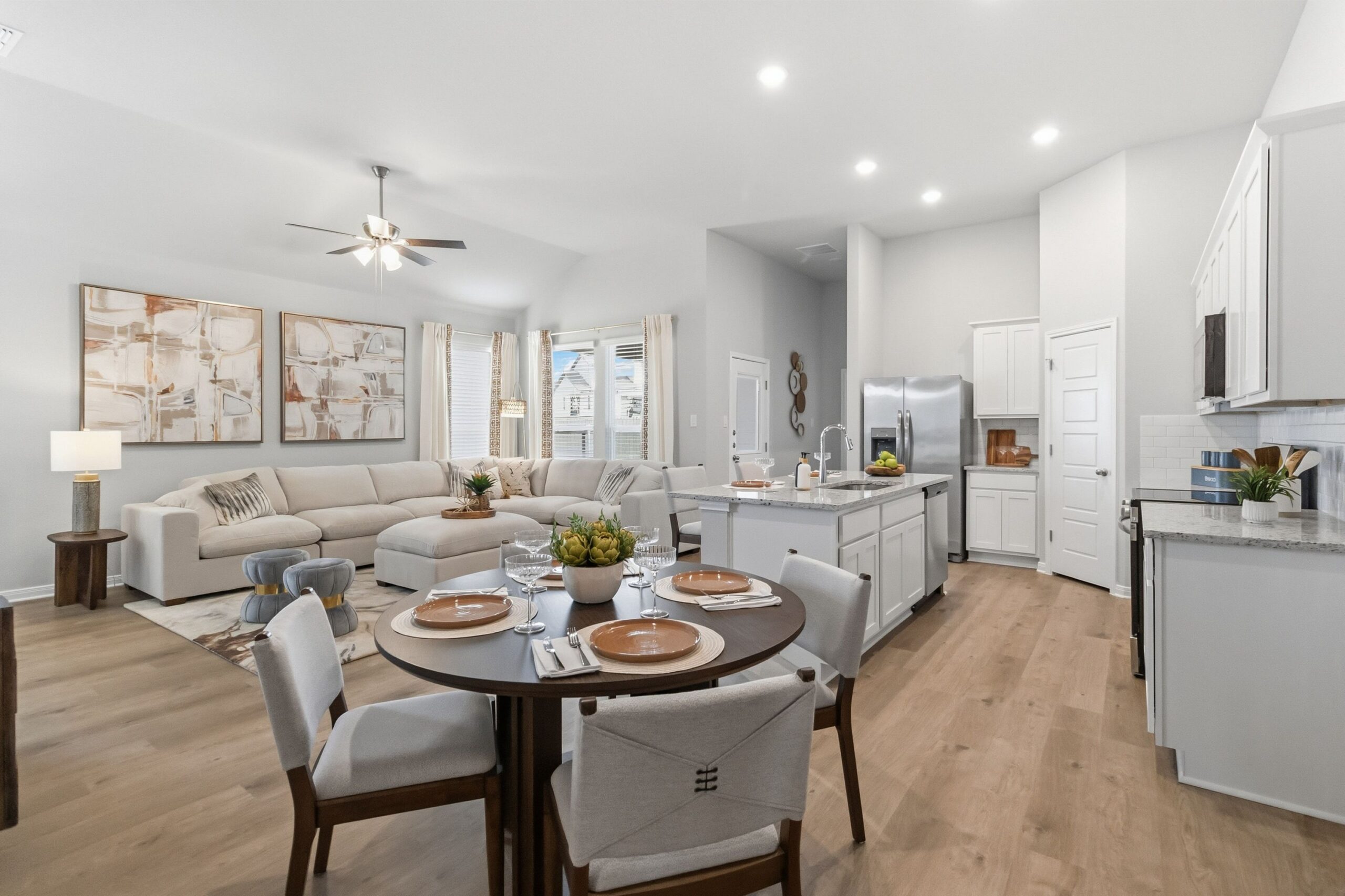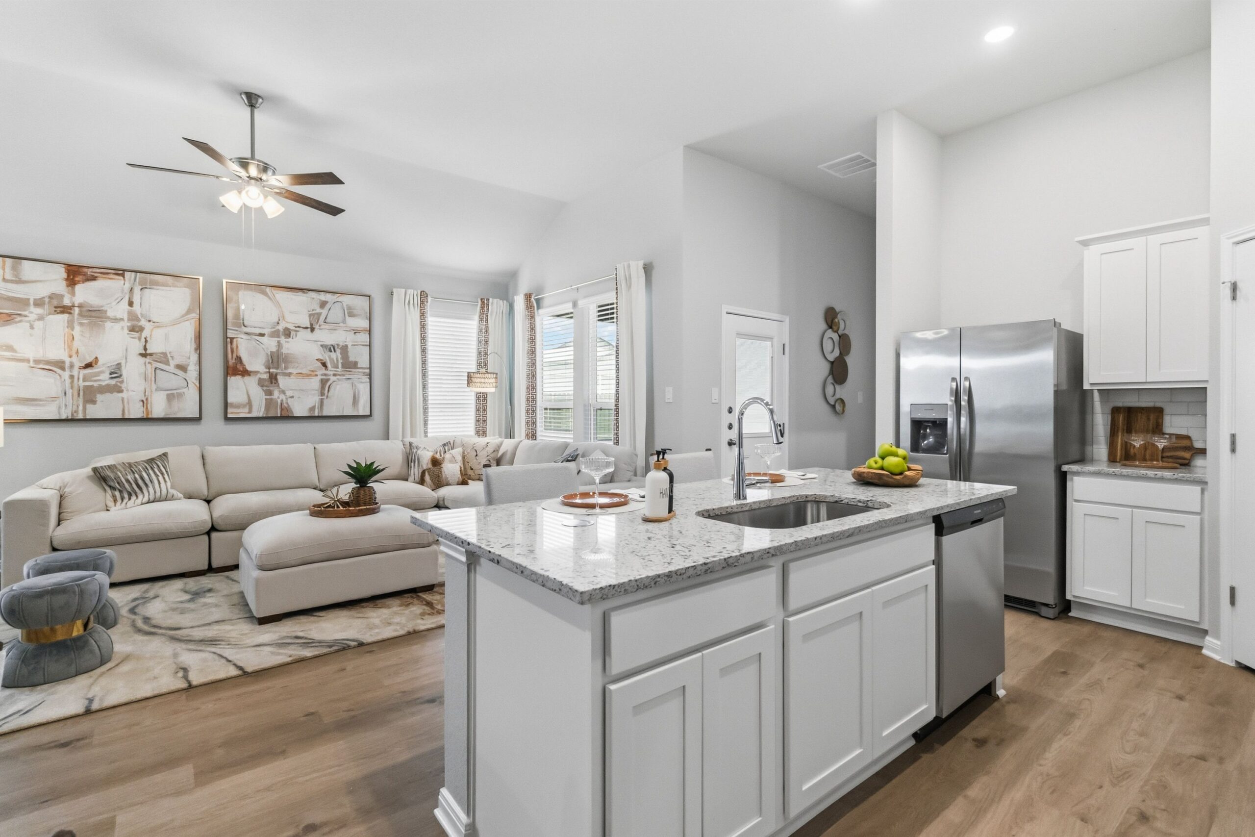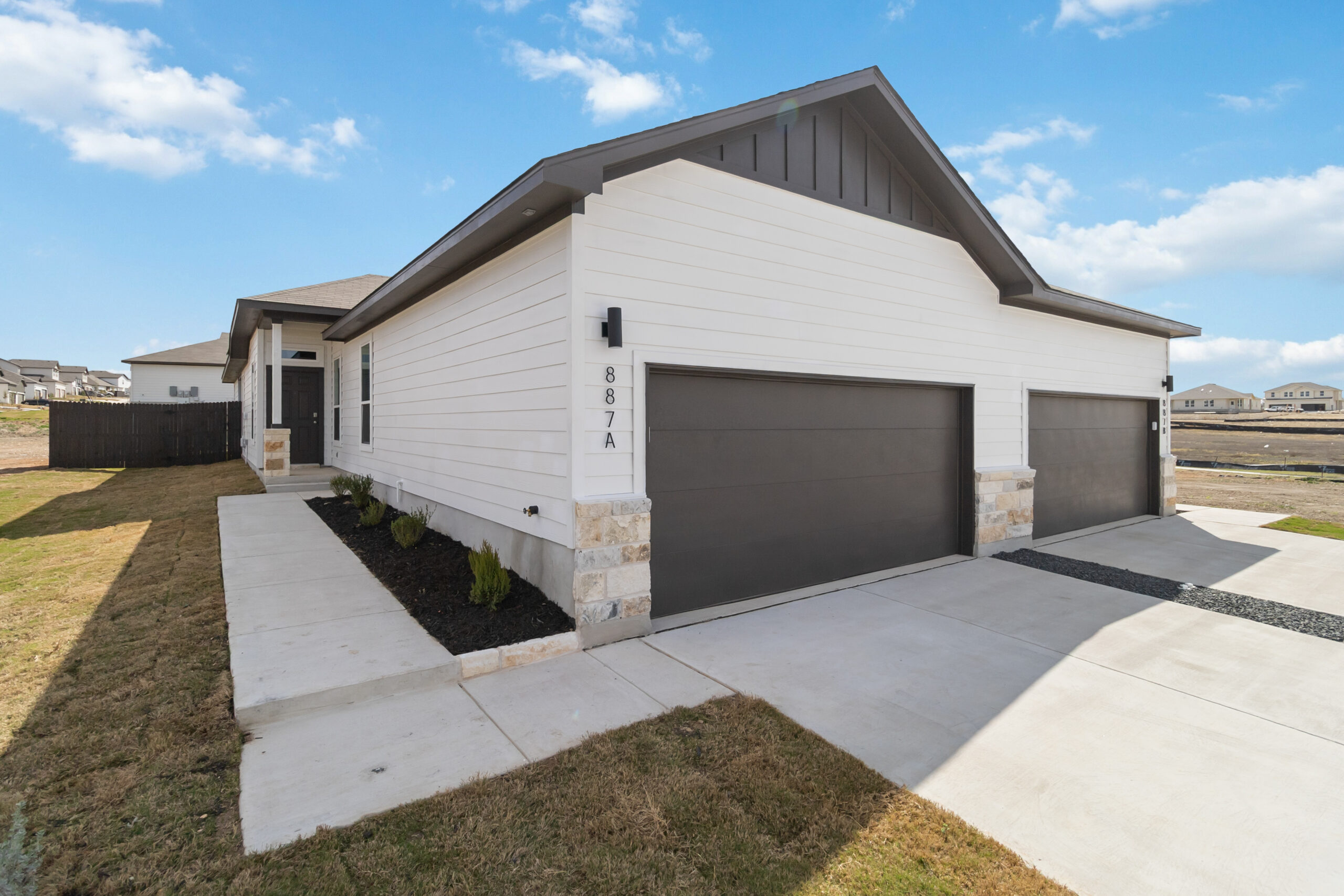 2,968 sq ft total; 1,464 sq ft (per duplex side) includes 3 bedrooms, 2 baths, large living space, central kitchen with additional space for bar seating, dining, mudroom, laundry room, covered patio, large backyard, full irrigation, privacy fence and front door smart keypad deadbolt.