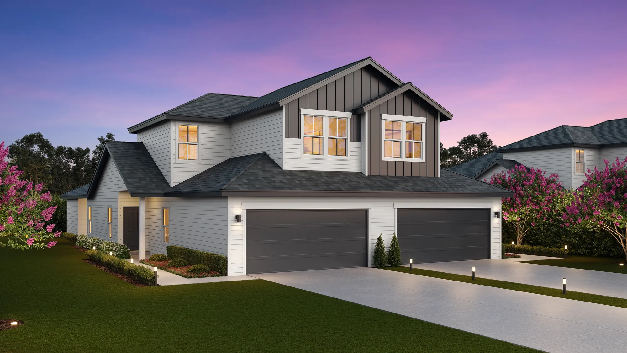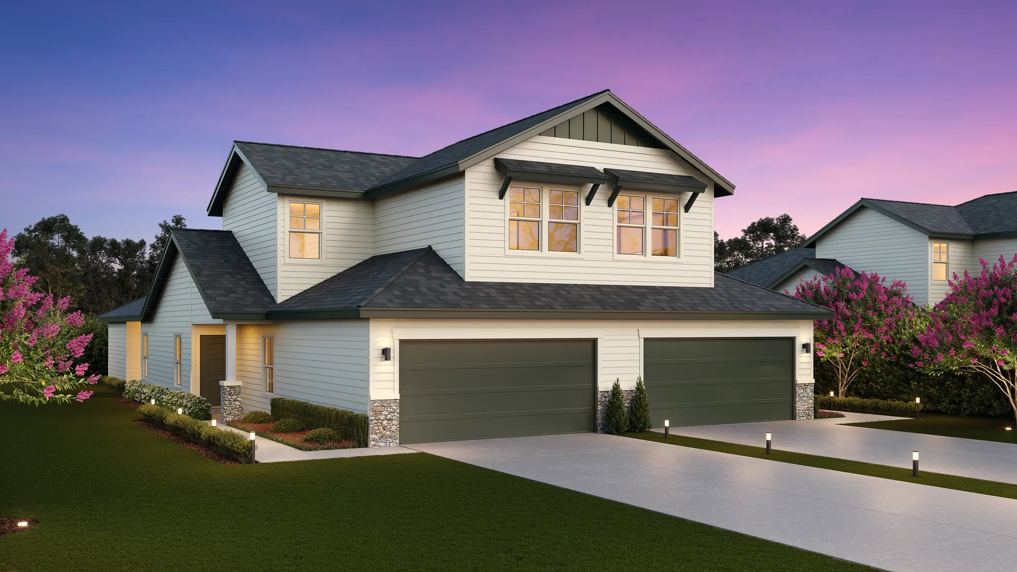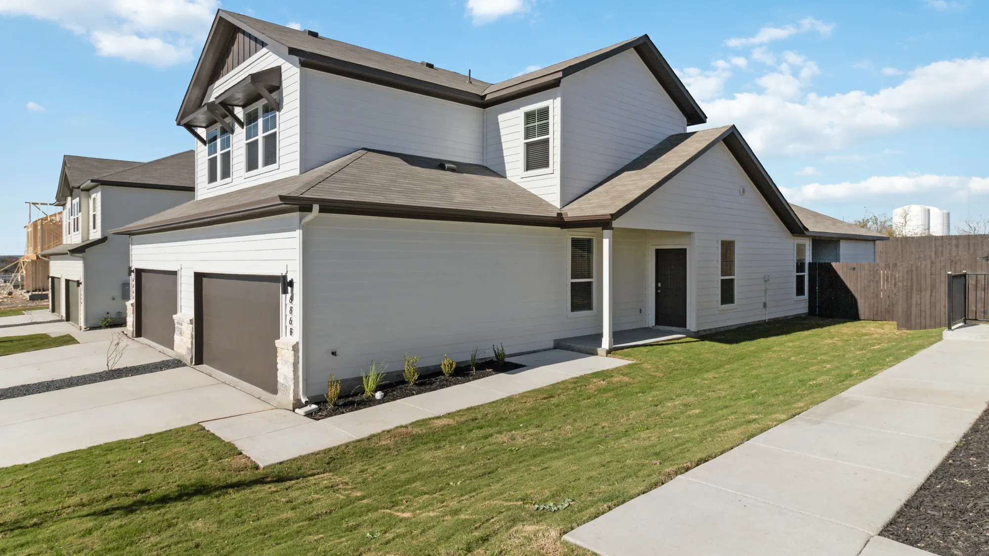 3,600 sq ft total; 1,800 sq ft (per duplex side) includes 4 bedrooms, 3 baths. Master/ensuite, bedroom 2, full guest bath, laundry room, mudroom, large living area, dining, central kitchen with island seating space, all located downstairs. Bedrooms 3 & 4 and bathroom 3 are upstairs. Each unit comes with 2 car garage, covered patio, large backyard, full irritation, privacy fence, and front door smart keypad deadbolt. Some communities have solar panels, EV charging stations (per plan only).
